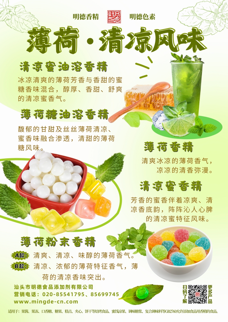明德薄荷清涼風(fēng)味香精 清涼薄荷 覆蓋糖果飲品場(chǎng)景汕頭市明德食品添加劑有限公司推出的薄荷·清涼風(fēng)味香精系列,涵蓋清涼蜜油溶香精、薄荷糖油溶香精、薄荷香精、清涼蜜香精、薄荷粉末香精等多種調性。產(chǎn)品清涼舒爽、香氣真實(shí),適用于糖果、飲料、口香糖、烘焙食品及復合調味等B端應用,幫助工廠(chǎng)快速打造沁人心脾的清涼薄荷風(fēng)味。