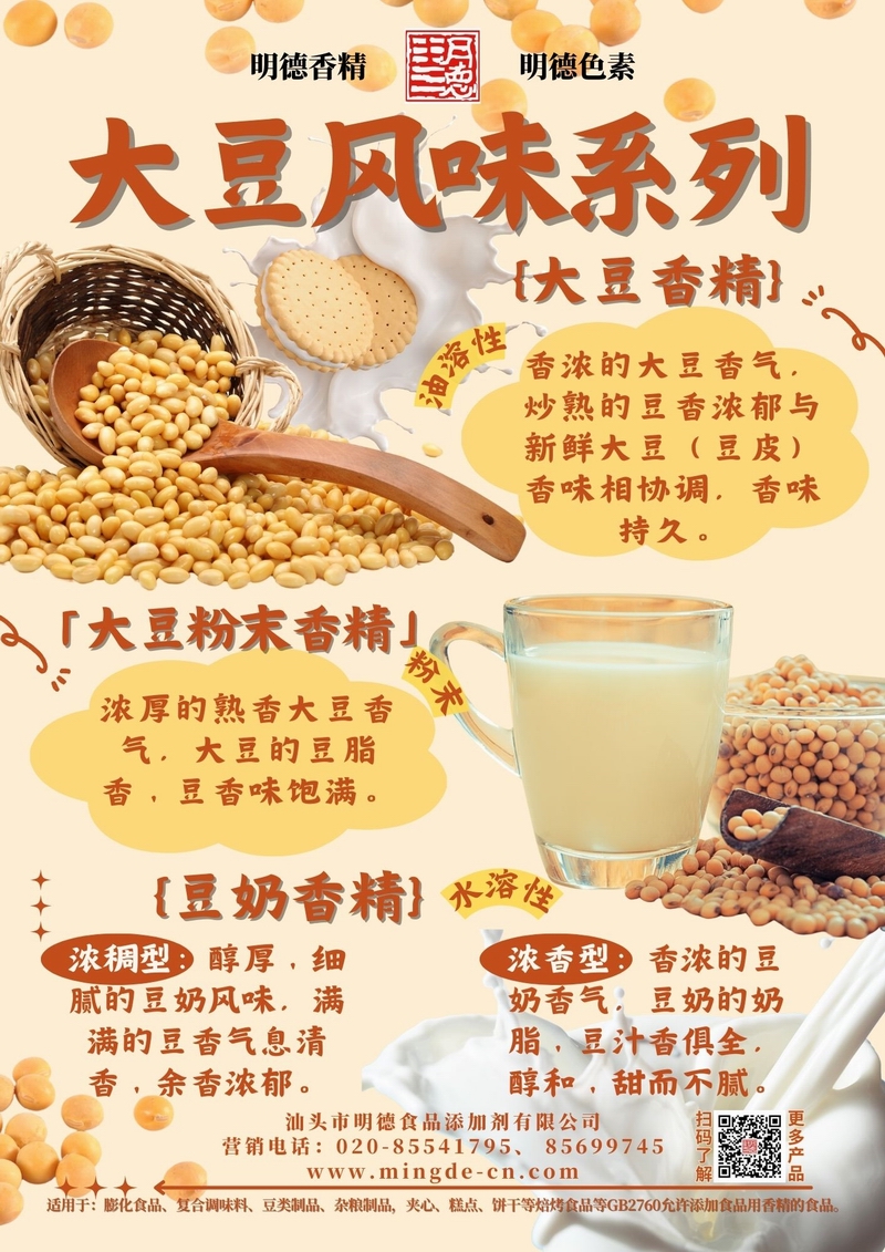 如需獲取不同版本風(fēng)味樣品或配方方案,歡迎聯(lián)系明德團隊。我們致力于為食品工廠(chǎng)提供真實(shí)、安全、高性?xún)r(jià)比的香精解決方案。汕頭市明德食品添加劑有限公司推出的大豆風(fēng)味系列香精,覆蓋大豆香精、大豆粉末香精、豆奶香精等多種調性,風(fēng)味真實(shí),留香穩定,適用于膨化休閑、復合調味、豆制品及飲料等B端工廠(chǎng),幫助快速打造具有記憶點(diǎn)的大豆類(lèi)風(fēng)味。